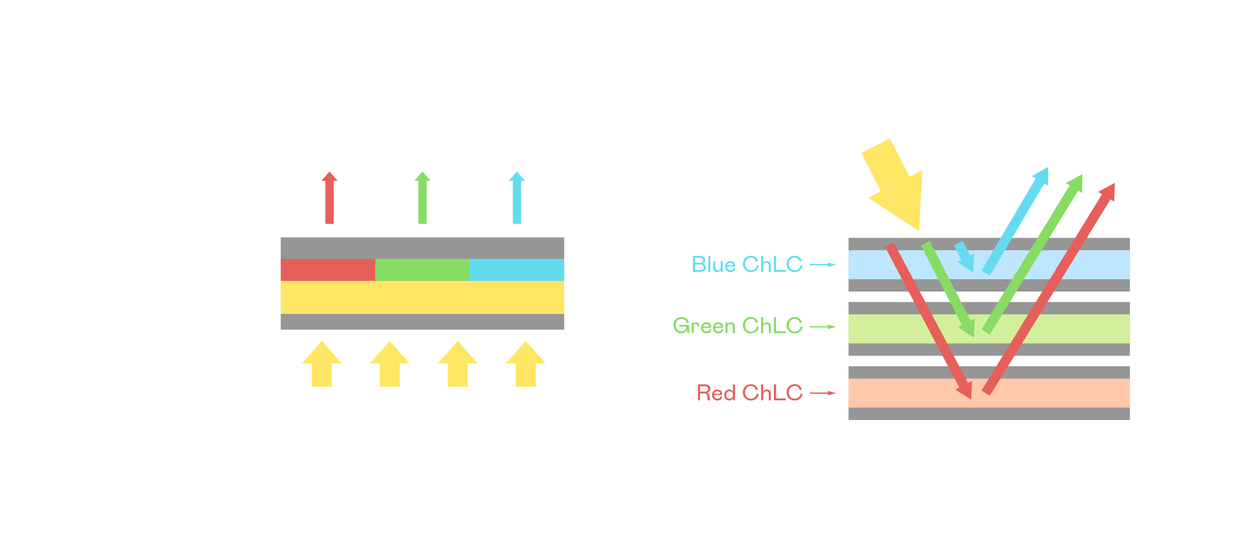 门徒娱乐胆固醇液晶显示器是由红、绿、蓝三层胆固醇液晶面板堆叠而成,并采用无彩色滤光片设计,减少环境光在反射过程中的损耗。